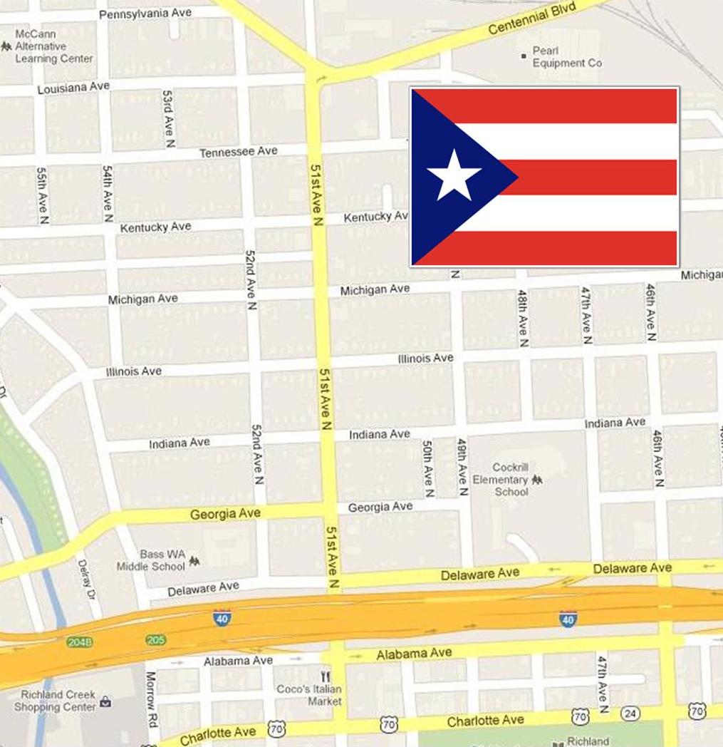 Map of West Nashville found at maps.google.com. Flag of Puerto Rico found at mapsofworld.com.